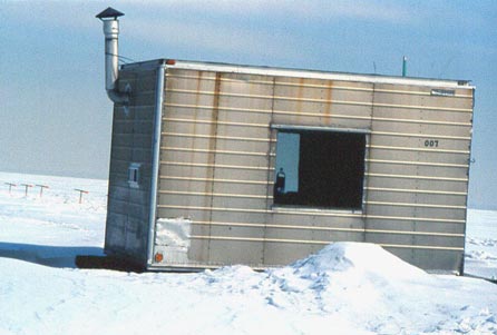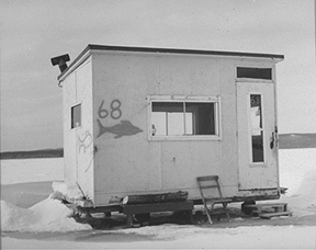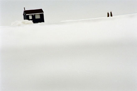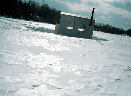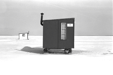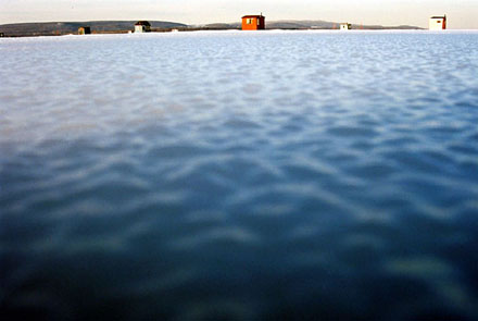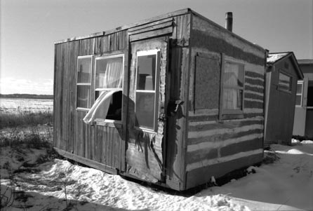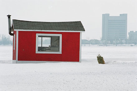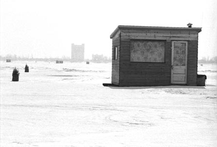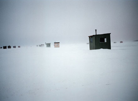 Helen has travelled to the same village on Lac Des Deux Montagnes (Lake of the Two Mountains), situated next to Montréal, every February for the last ten years. Ice-fishing is an age-old tradition. People wait for the lake to freeze to a depth solid enough to withstand the huts, and return each year to fish and meditate in this still, quiet landscape.