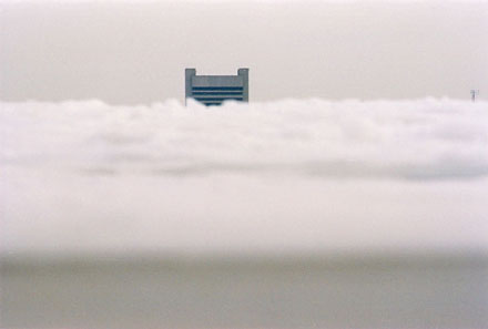Helen takes photographs lying on her stomach on the ice. Her images portray the dominance the snow-scape has over the huts that are dotted across the frozen lake and over the surreal urban-scape in the background.